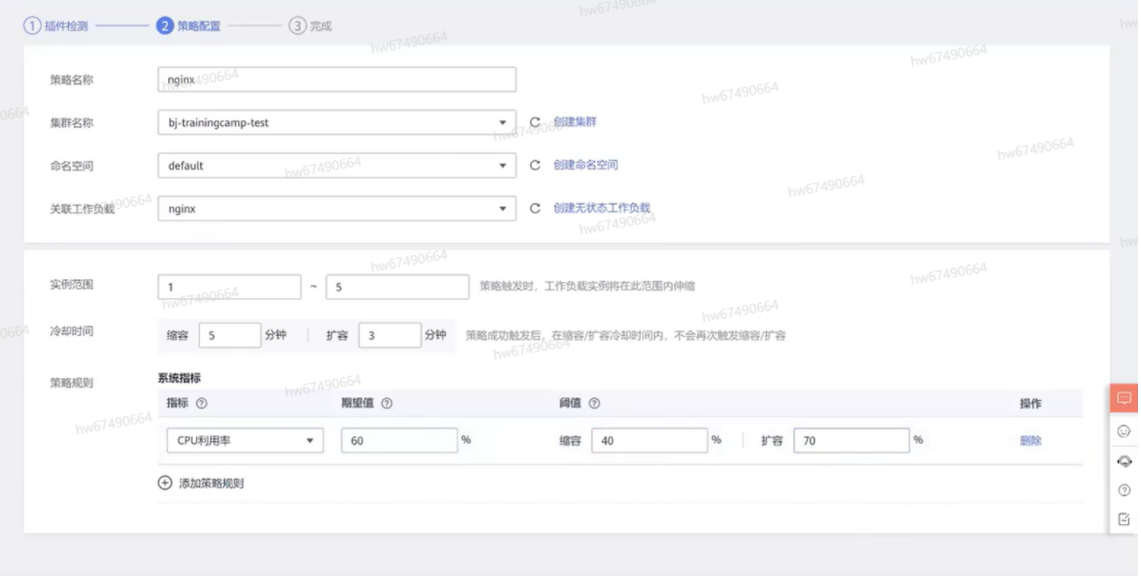 本次实验还是通过无状态负载Deployment的基于nginx K8S集群结点来进行测试弹性伸缩的HPA,先点击左侧弹性伸缩页面,然后创建工作负载HPA策略,然后我们这里选择工作负载为nginx,实例范围希望工作负载,能够在哪个范围内进行弹性伸缩,选择1-5即可,冷却时间缩容5分钟,扩容3分钟,加一个策略可以基于CPU的利用率,期望值是60%哈