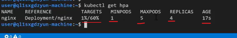 可以看到nginx的副本数已经变为1,所以说我们在到后台终端去看当前副本数已经从4变成1,这样我们就完成一次HPA弹性伸缩实验啦。