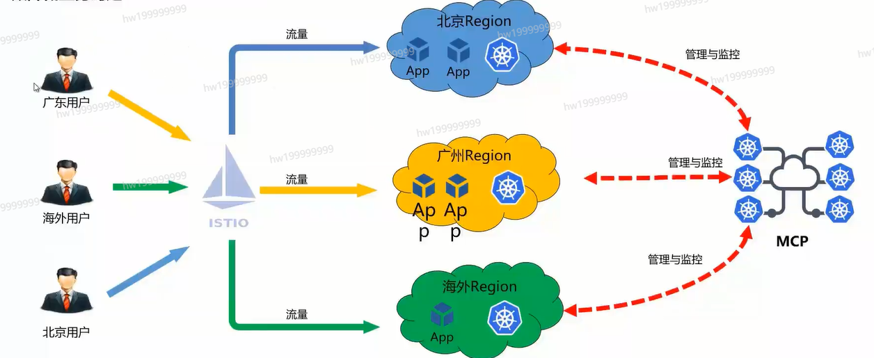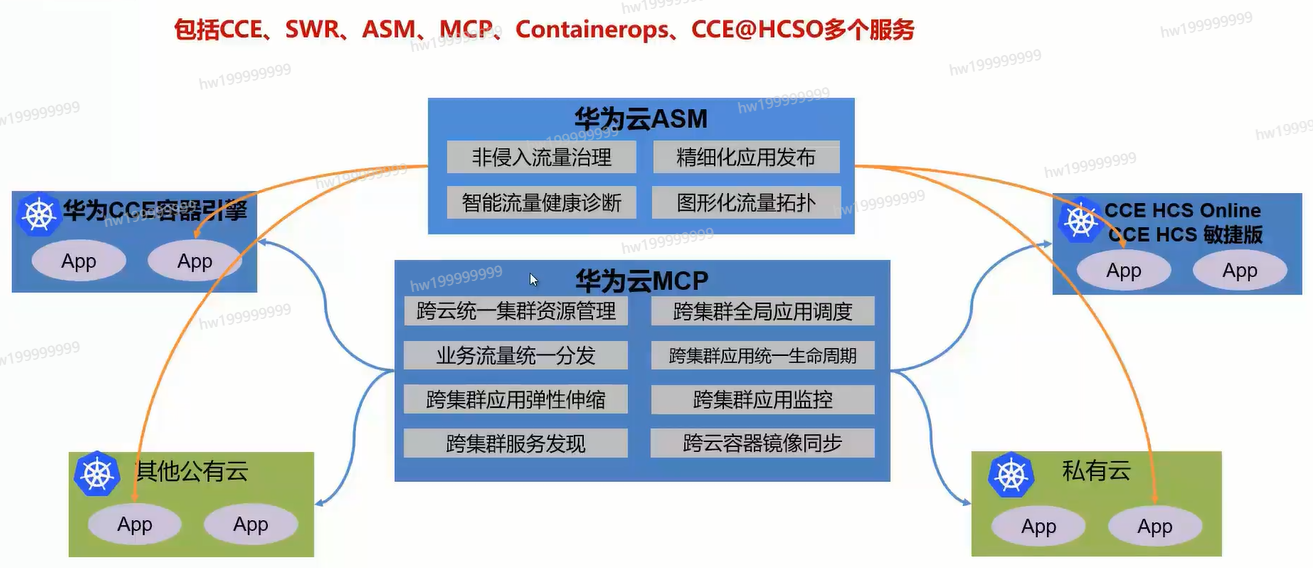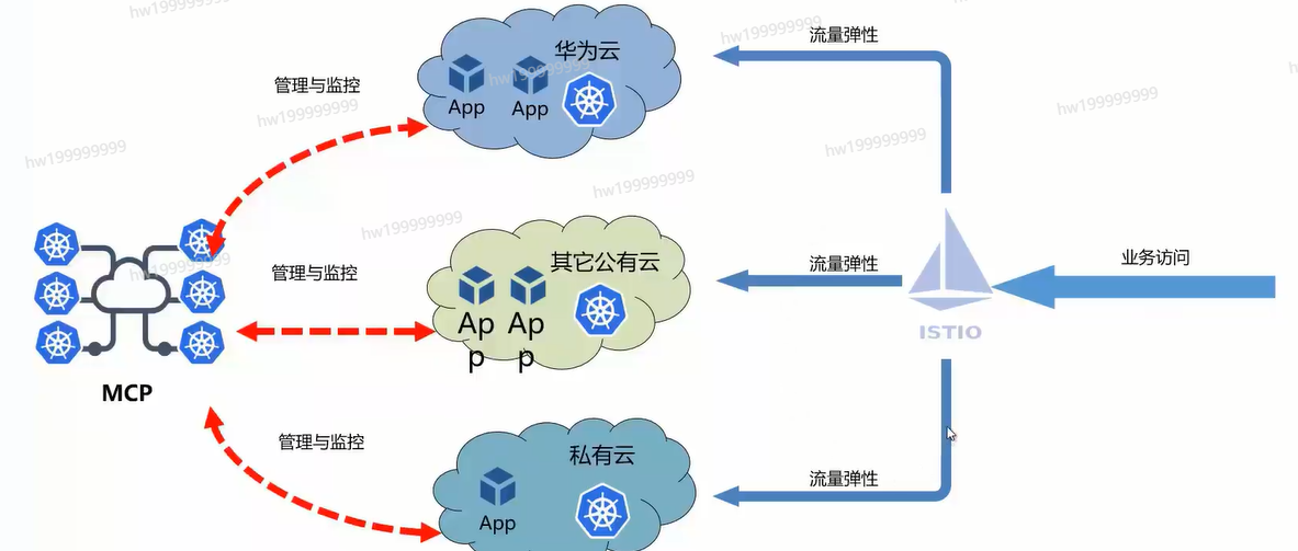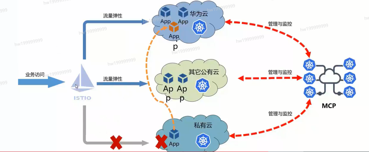 通过华为容器混合云和多云解决方案,应用部署在多云和混合云集群中,通过ASM自动切换流量;同时通过MCP可应用实例将自动弹性到其他云上,实现业务的荣在管理