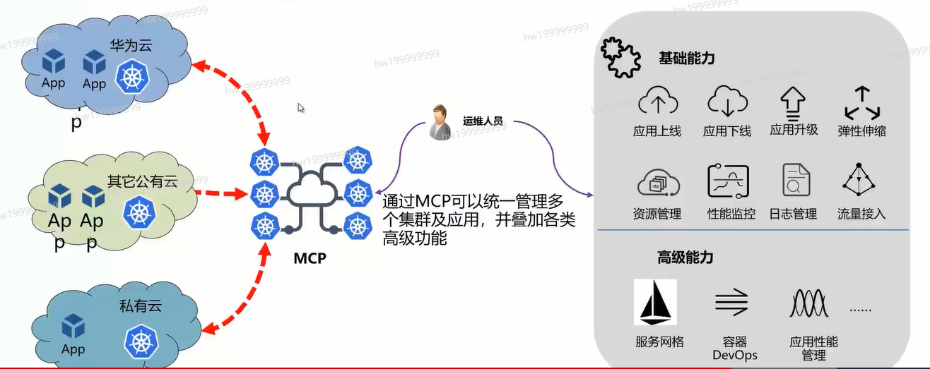 通过华为容器混合云和多云解决方案,客户可以统一管理多云环境中的K8S集群及应用,并且通过MCP的开放平台能力,接入各类高级功能如服务网格、容器DevOps、应用性能管理等