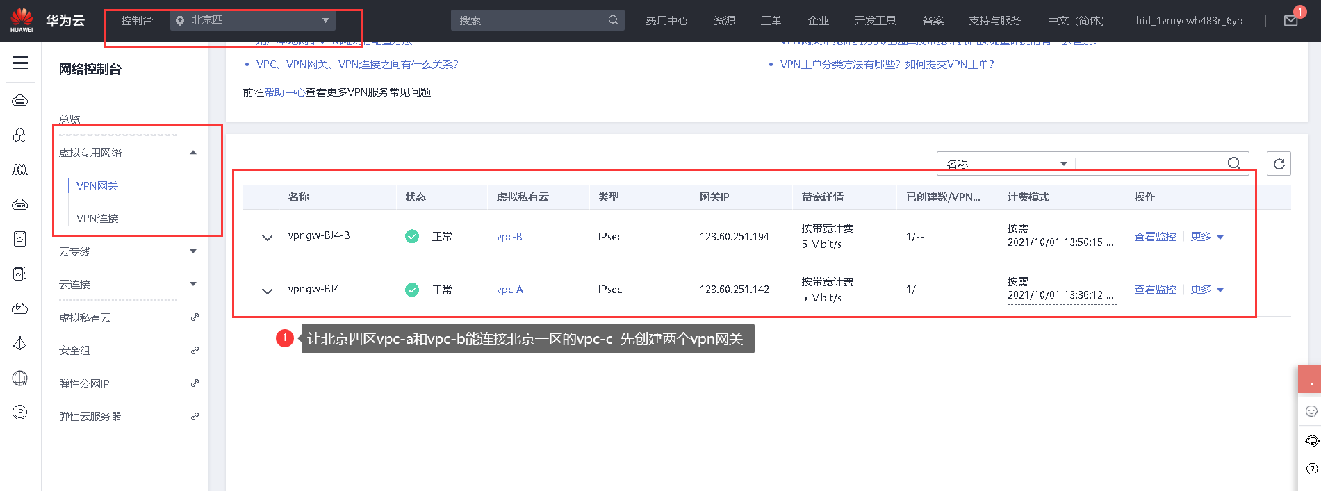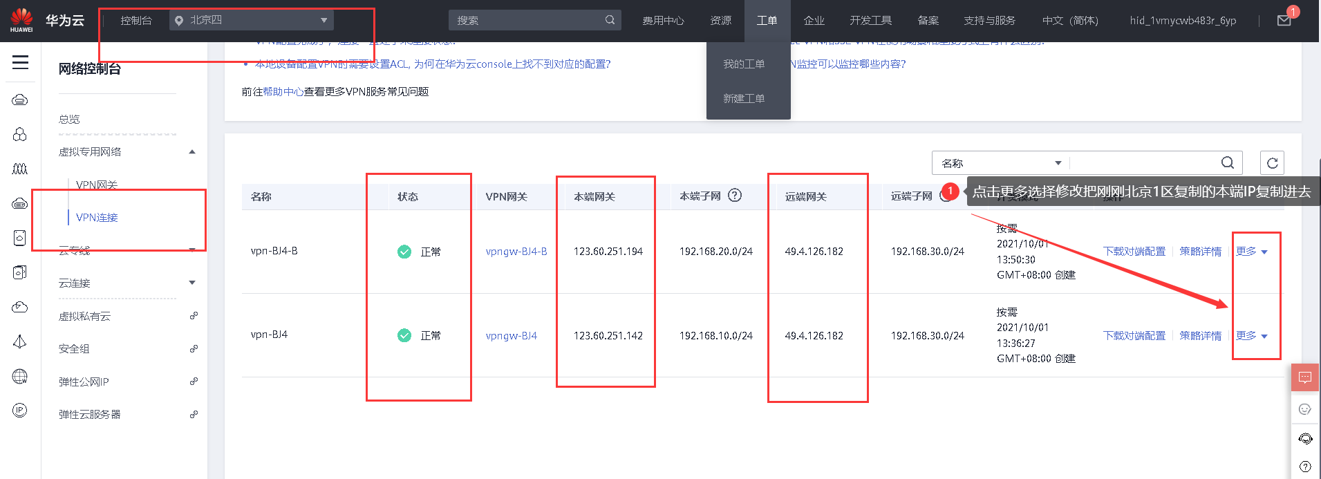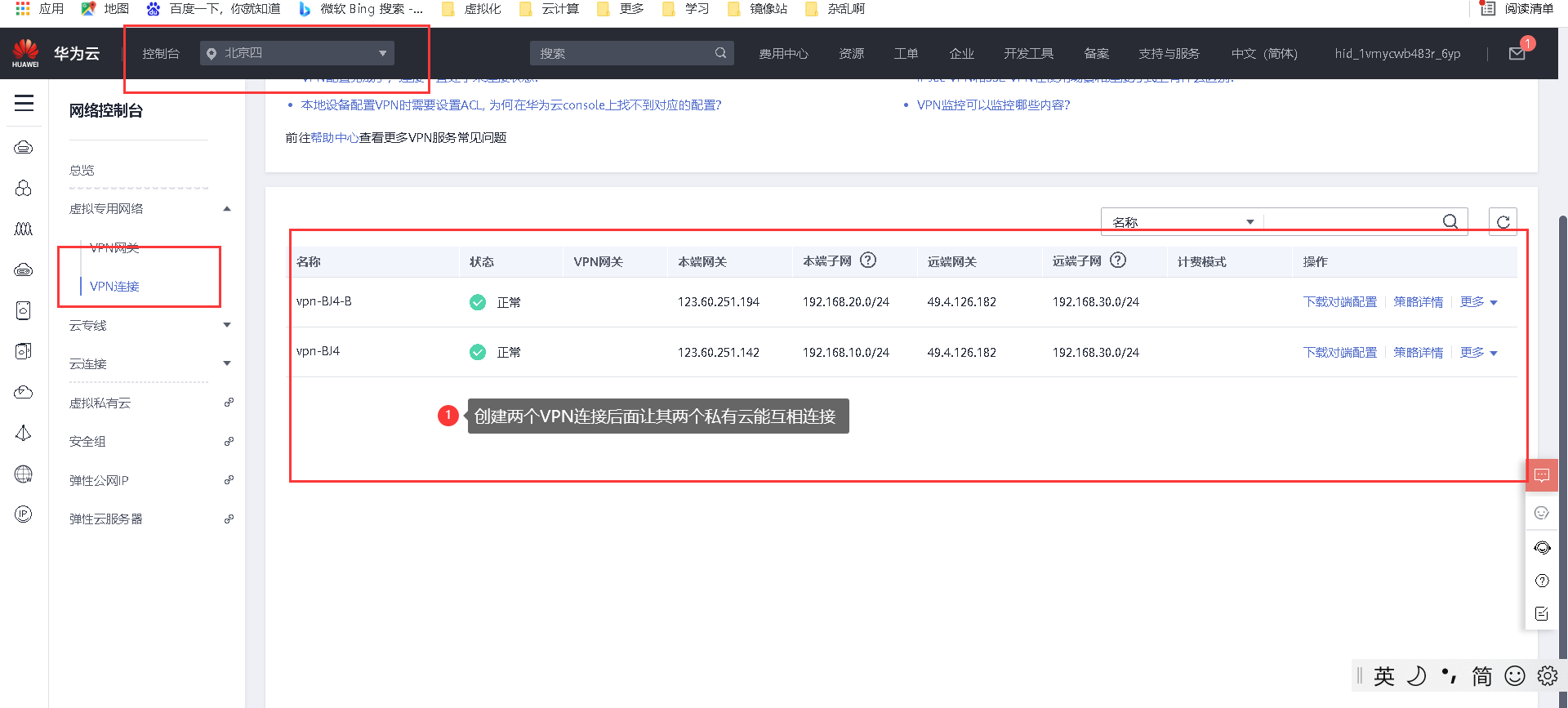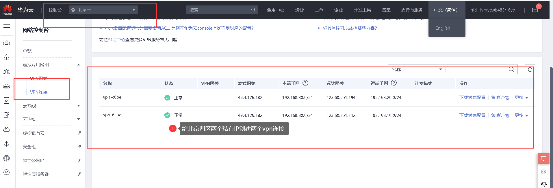当bj四区域弹性IP配额不足时,可在其他区域购买弹性IP用VPN专线连接使其可以互相通信: