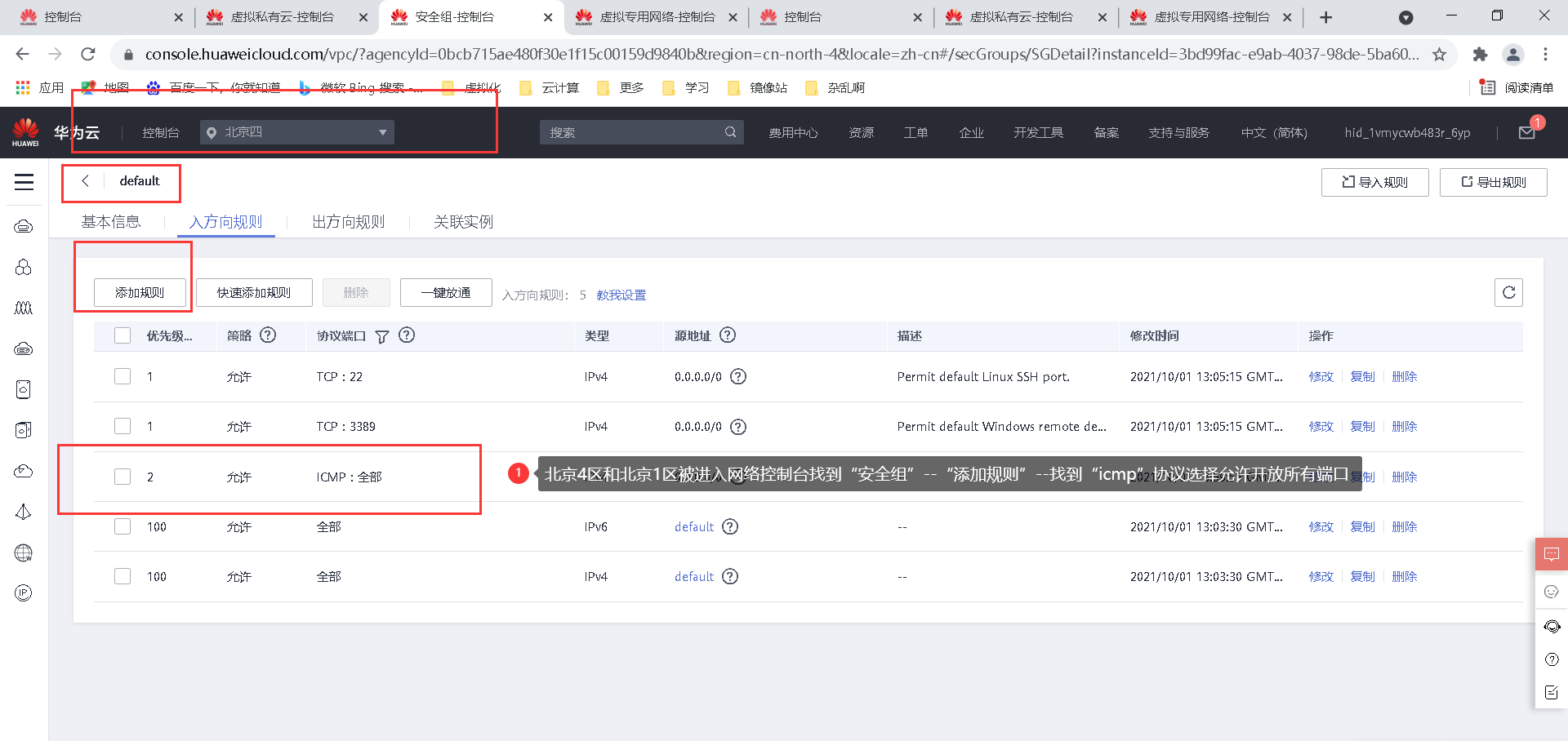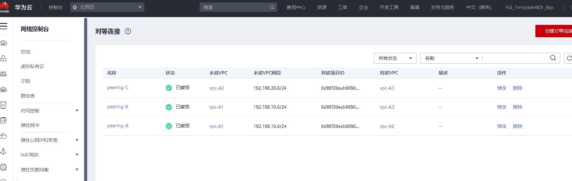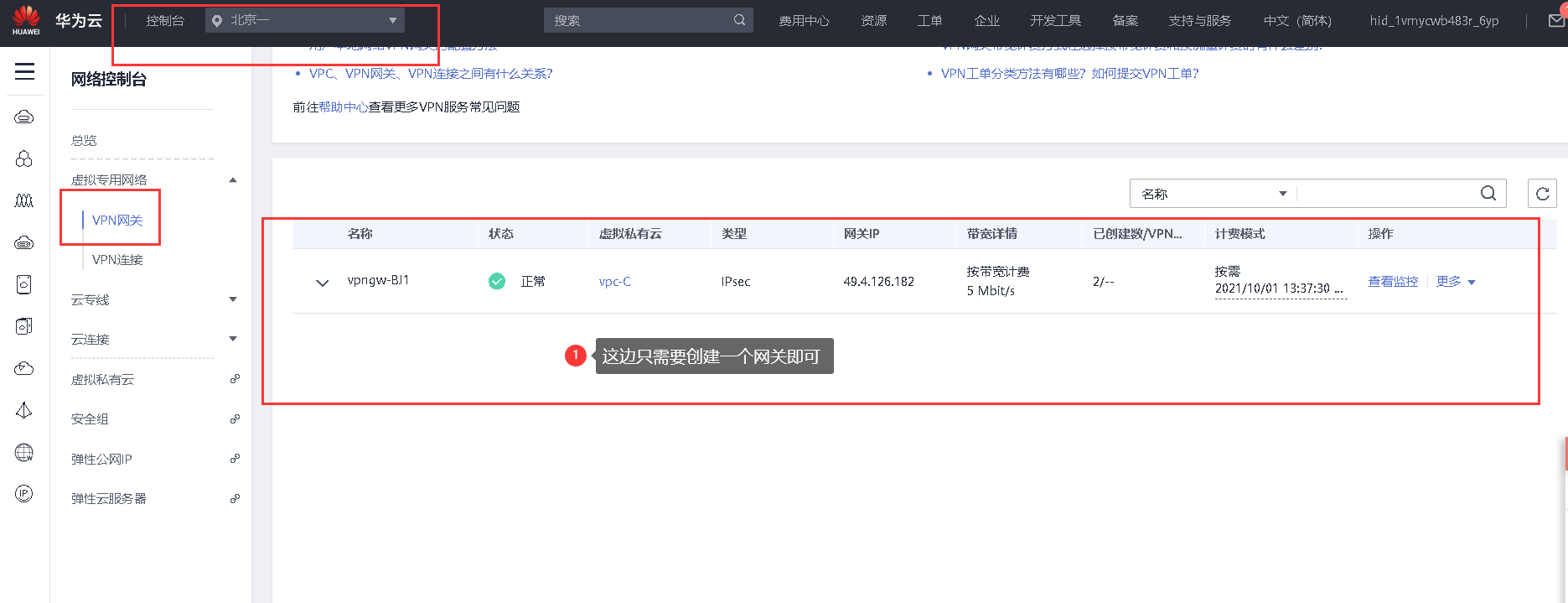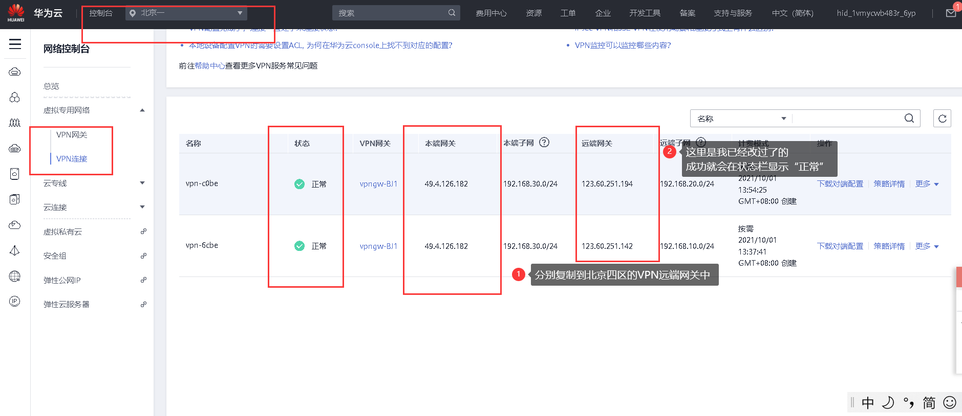 当bj四区域弹性IP配额不足时,可在其他区域购买弹性IP用VPN专线连接使其可以互相通信: