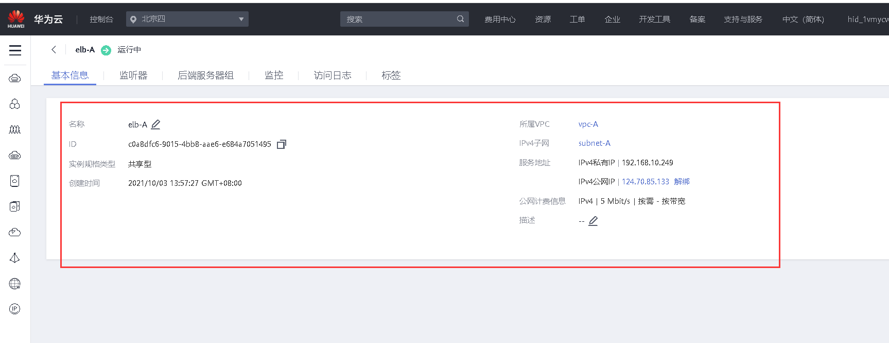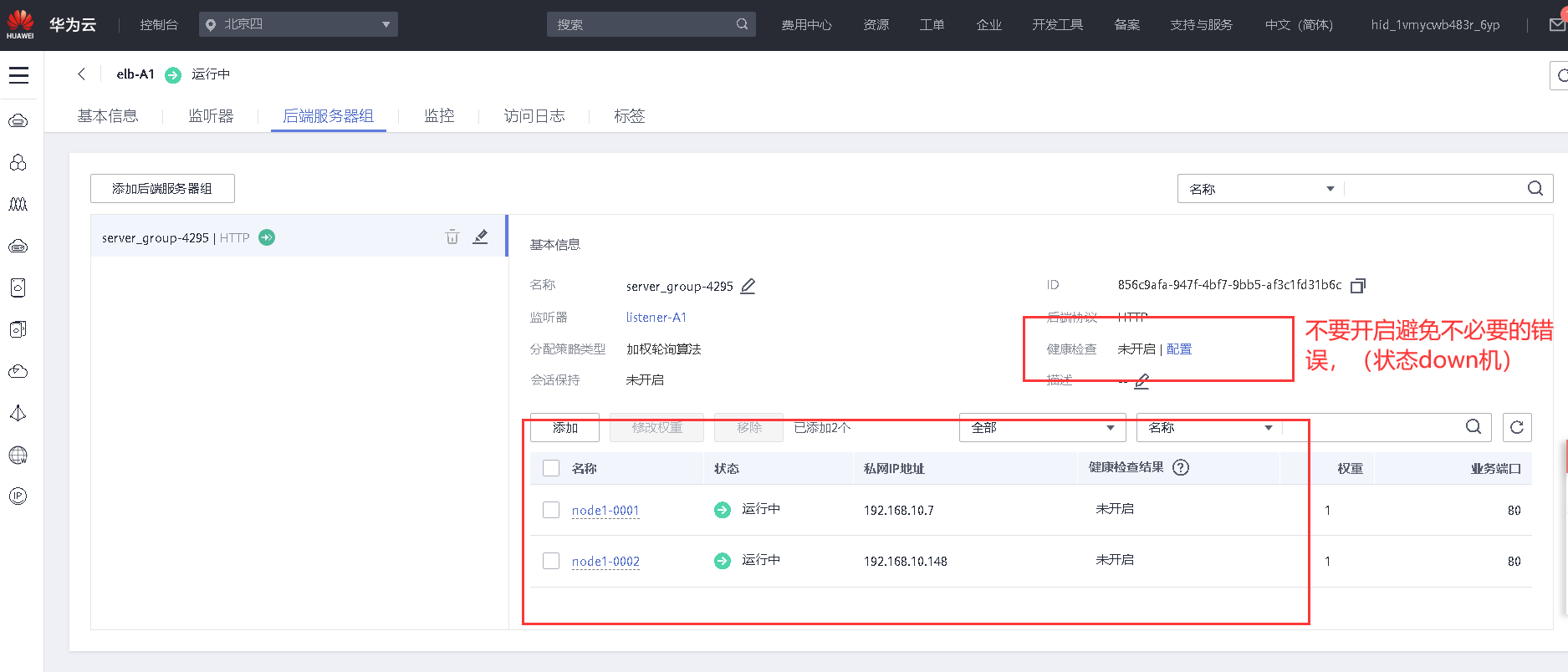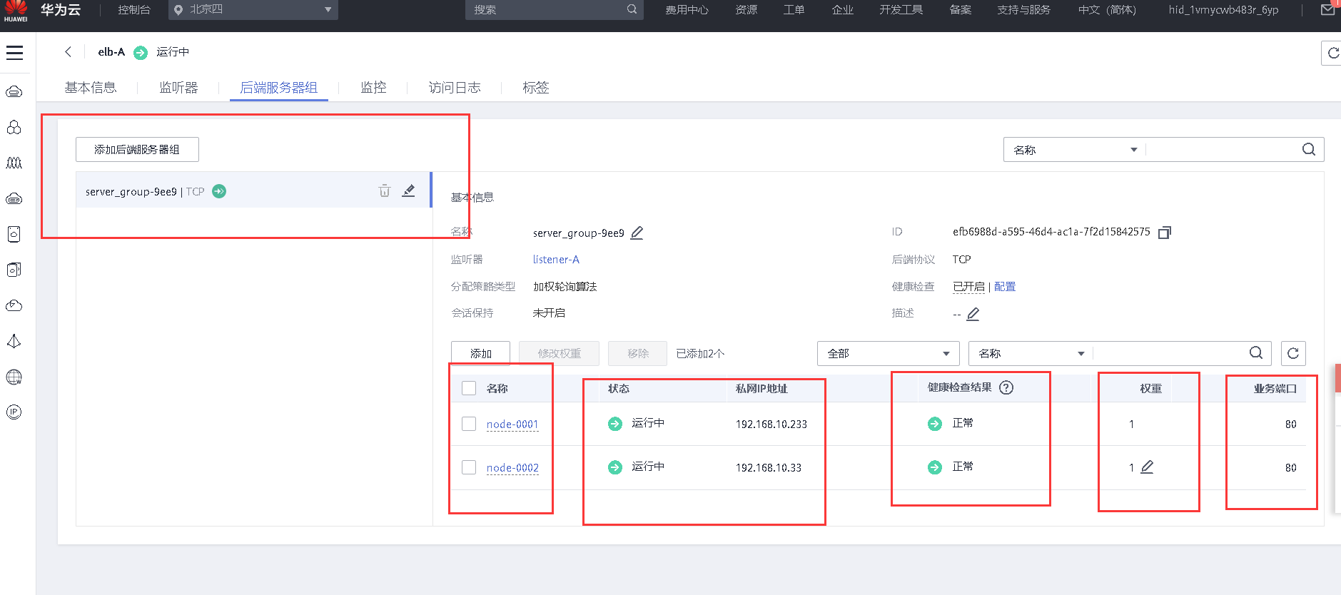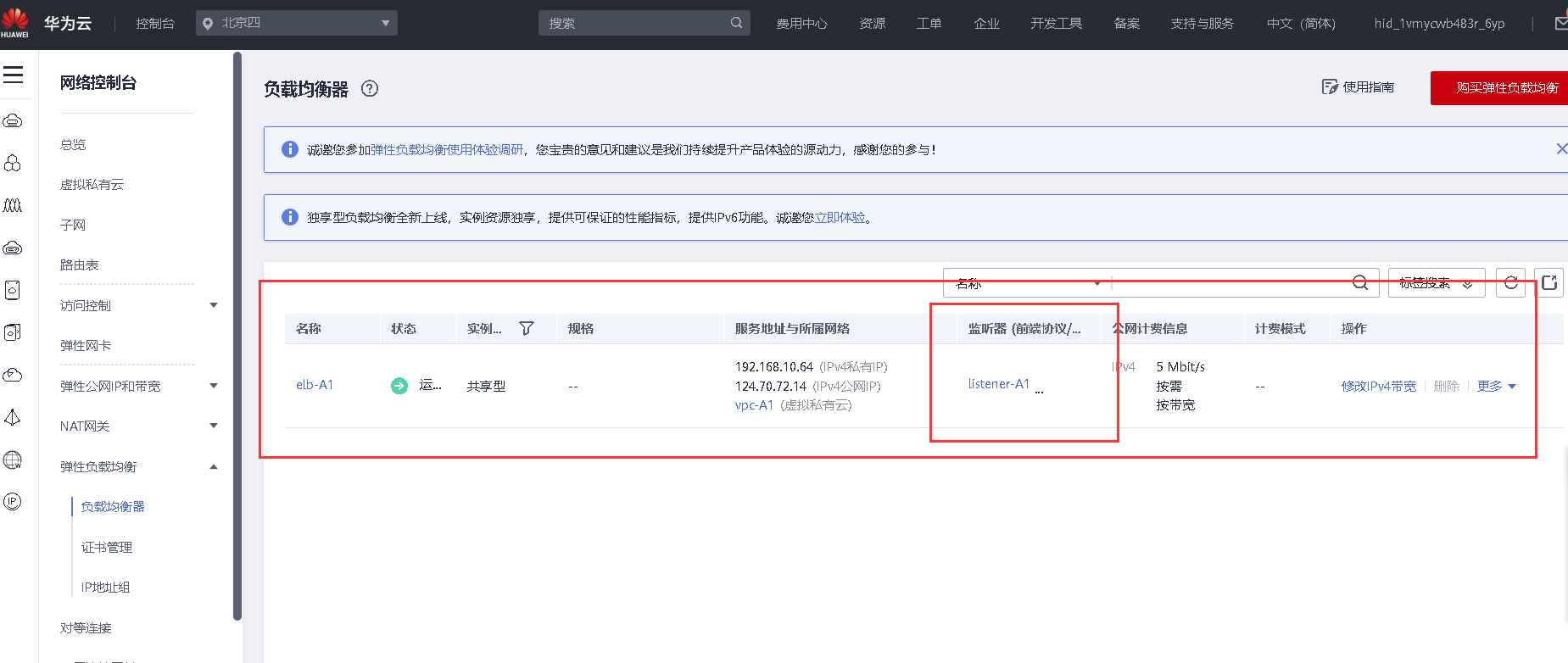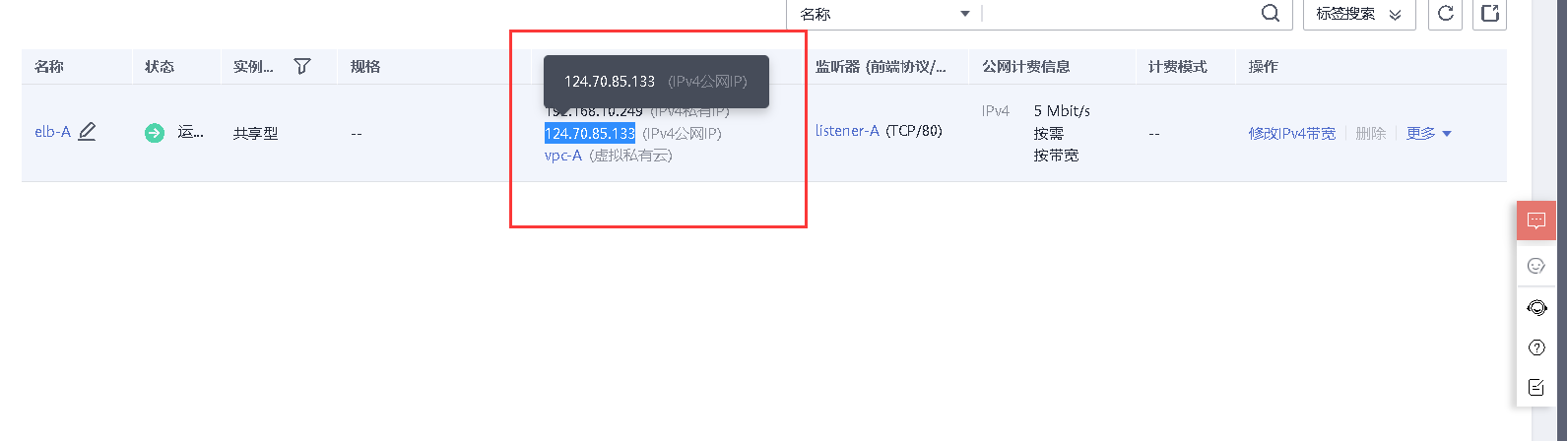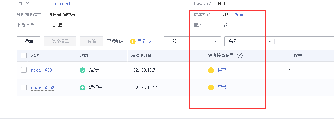 7、创建一个负载均衡器,将node1和node2加入负载均衡的后端。设置一个可用的服务IP,服务端口为80,并绑定一个可用的弹性公网IP,对弹性公网IP进行Web访问测试。【40分】