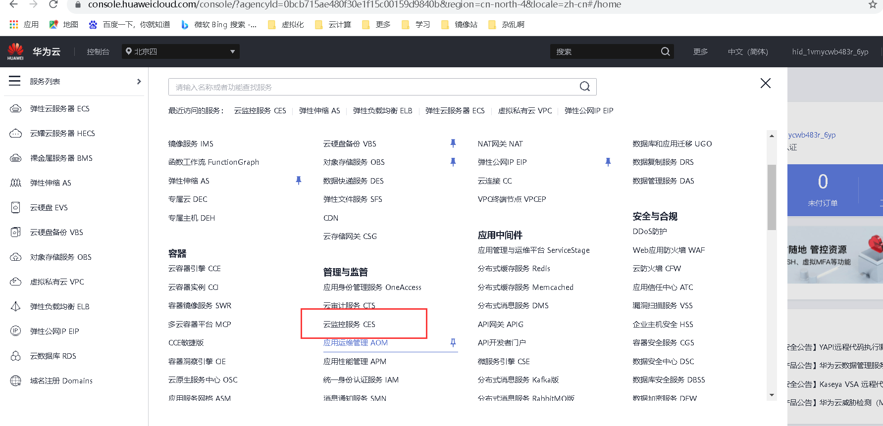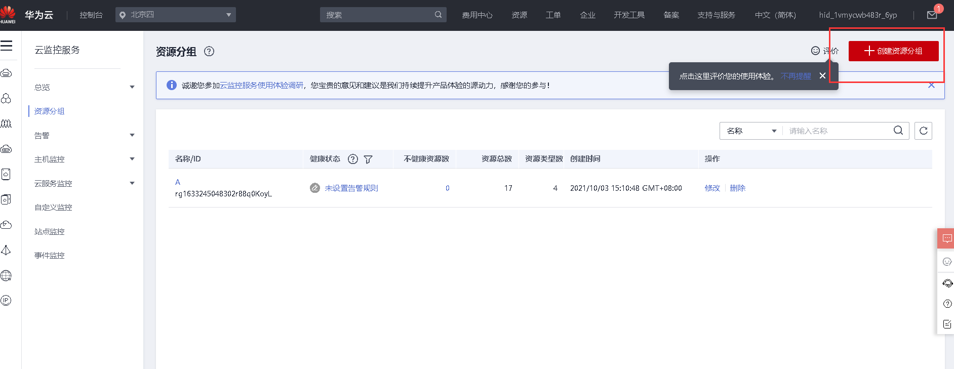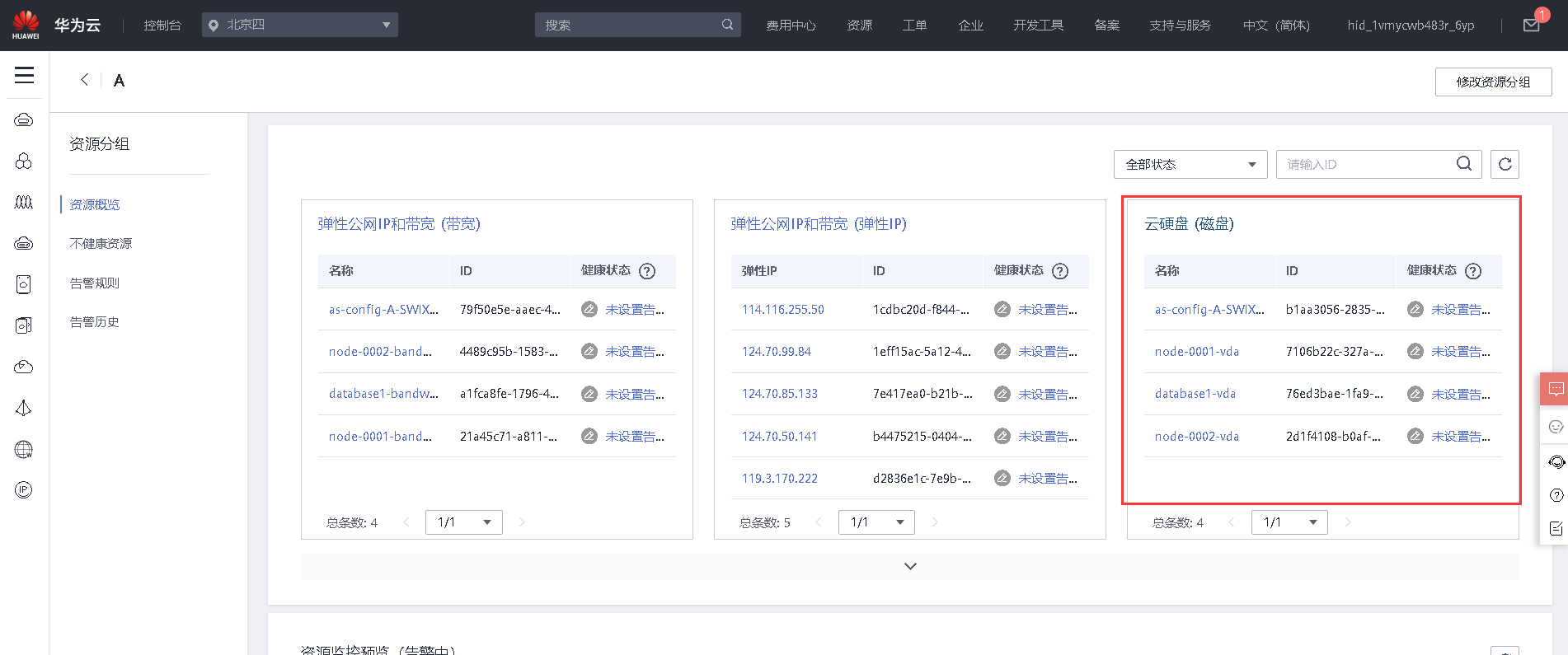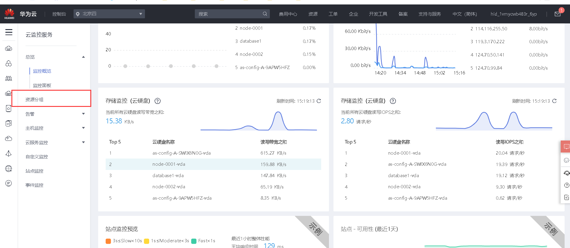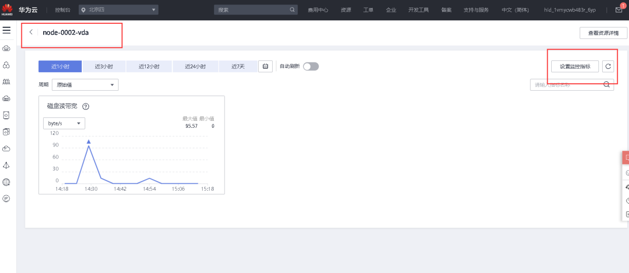 5、 云监控服务界面,也可以查看主机监控、云服务监控信息,需要注意的是在进行主机监控时需提前安装插件,要求在云服务监控当中设置磁盘读带宽监控指标。【50分】