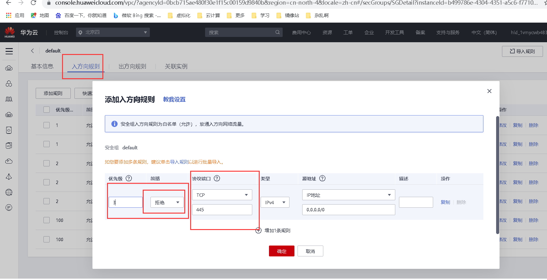 6、 在安全组上配置阻止445端口的流量。【20分】
