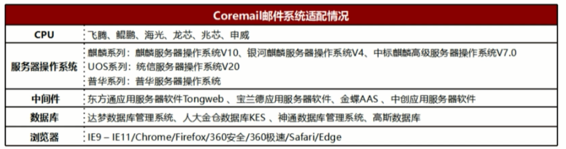 CoreMail邮件系统研发中心资源向可信项目全面倾斜,全力适配可信目录内的CPU、操作系统、数据库、中间件等产品,充分满足可信客户的应用需求。截止目前已经适配了六种CPU、两大国产体系(鲲鹏体系、PK体系)、四大中间件、两大数据库等,适配情况如下所示: