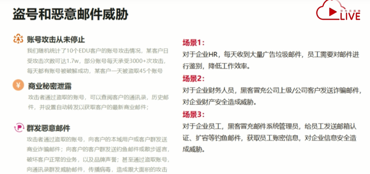 面临的难题有邮箱被盗号、被盗号后导致的大量邮件攻击、垃圾邮件、钓鱼邮件,以及这些邮件所引起的连锁损失。