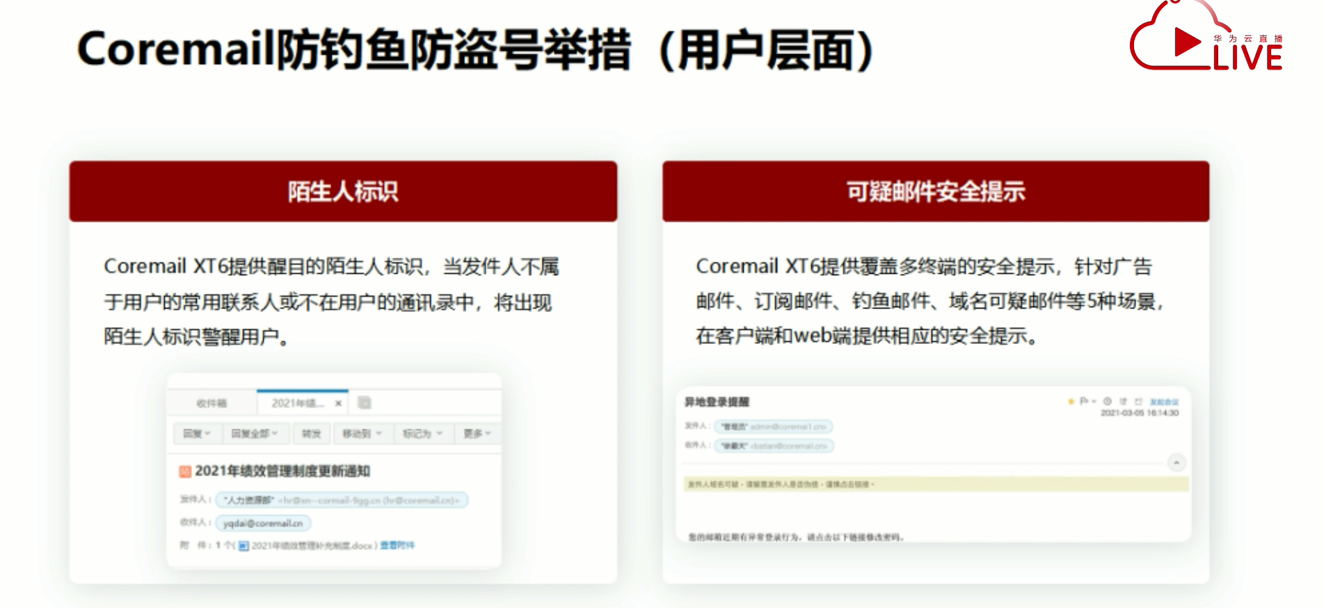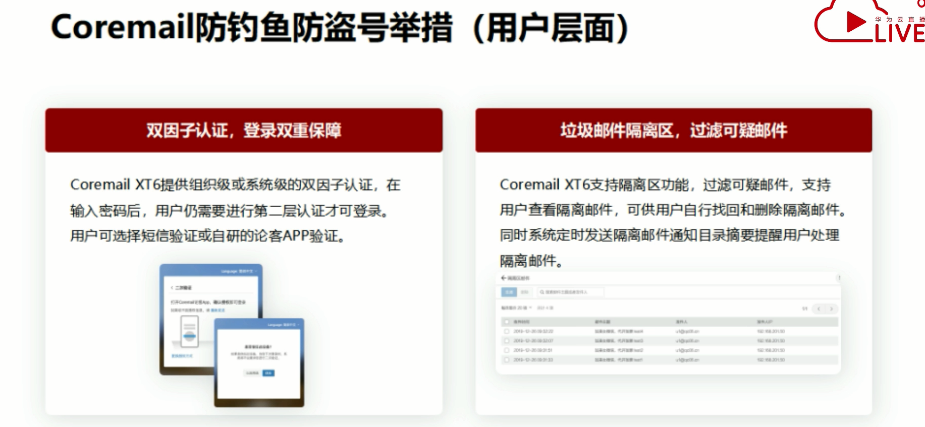 用户层面采用双因子认证,登录双重保障,对垃圾邮件设置隔离区,过滤可疑邮件,陌生人识别等措施,如下图所示: