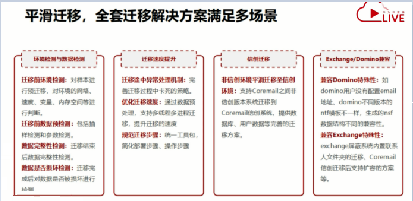 CoreMail产品在数据迁移方面有两种措施,一种是应对于简单的迁移业务拥有业务搬家的功能,另一种是应对于原有有业务系统需要对接等复杂需求的,会提供专用的迁移工具完成迁移。