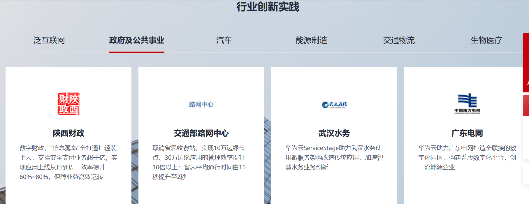 华为云原生2.0应用行业较广泛,涉及如互联网、政府及公共事业、汽车、能源制造、交通物流、生物医疗等行业。从目前使用情况来看,达到了预期设定的效果,同时得到了用户的一致好评。