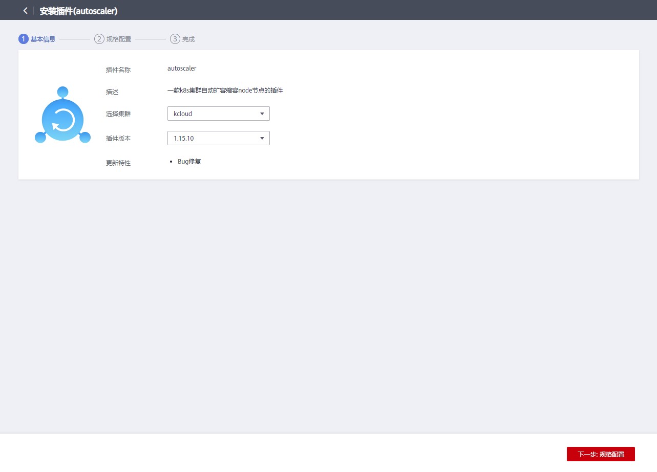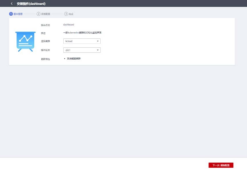 选择集群 kcloud,选择插件版本。点击下一步。