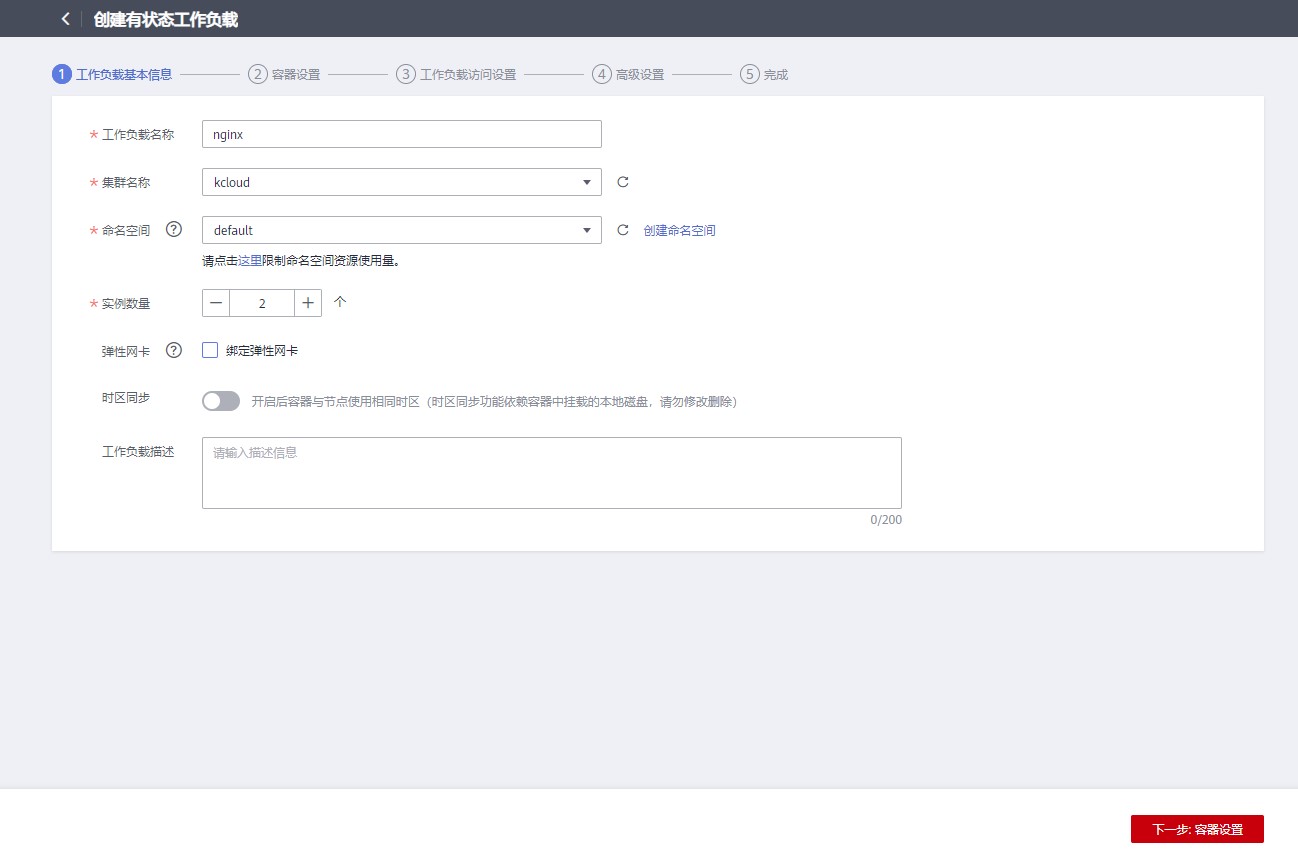 设置工作负载名称 nginx,选择 kcloud 集群和 default 命名空间,实例数量为 2 个。