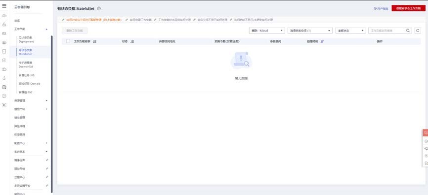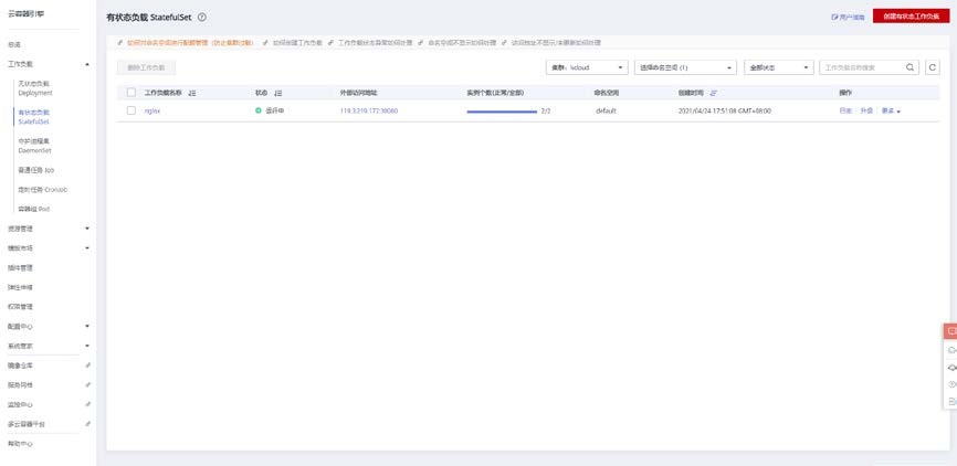 点击工作负载>有状态负载,点击右上角创建一个有状态工作负载。