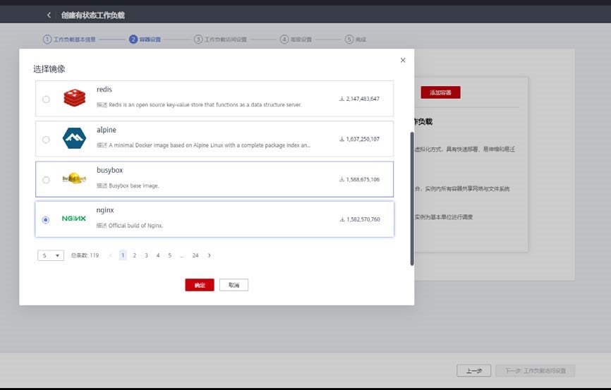 添加容器,选择公共镜像源 nginx 点击确定。
