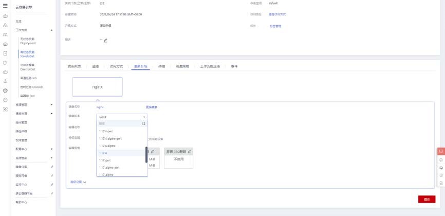 在有状态负载控制台,点击工作负载后的升级按钮,进入升级页面。