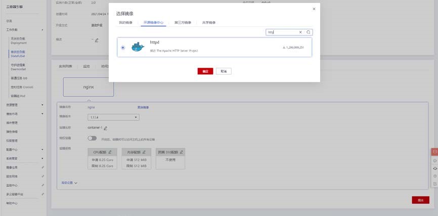 也可升级工作负载使用其他镜像,在升级页面点击更换镜像按钮,选择使用 httpd 镜像