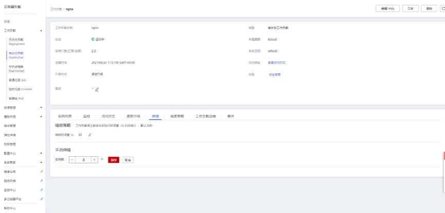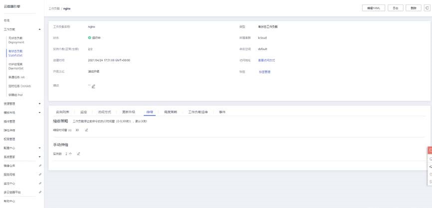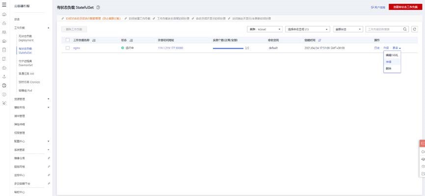 打开有状态负载控制台,点击工作负载后面的更多按钮,点击伸缩功能。