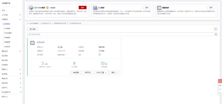 等待 6-10 分钟即可完成集群创建。可以云容器引擎中资源管理>集群管理查看到集群状态。