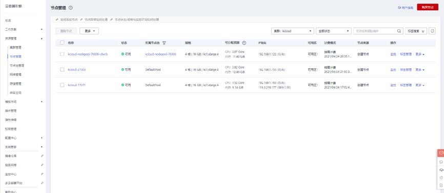 打开集群管理控制台,点击 kcloud 集群的购买节点按钮,添加一个节点。