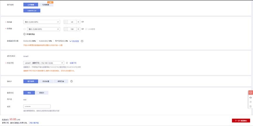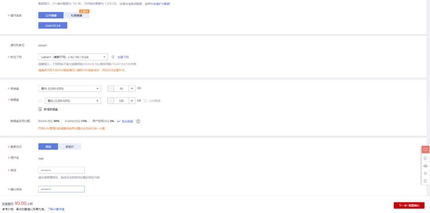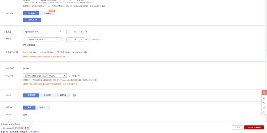 使用公共镜像 EulerOS 2.8 镜像,系统盘和数据盘根据需求进行选择,集群子网所在子网选择 subnet1。