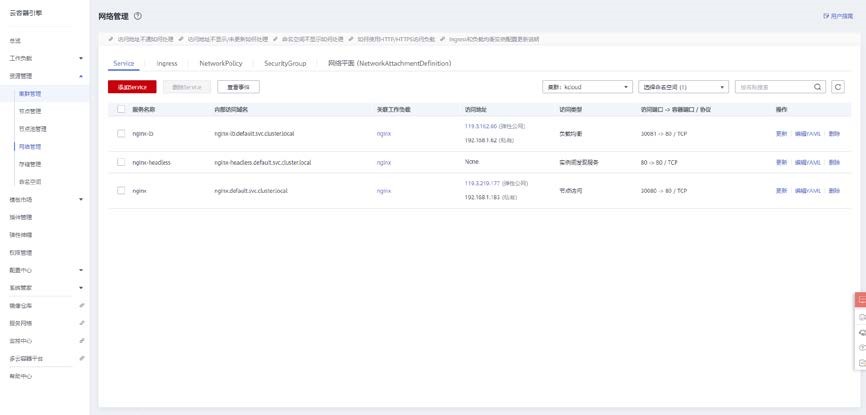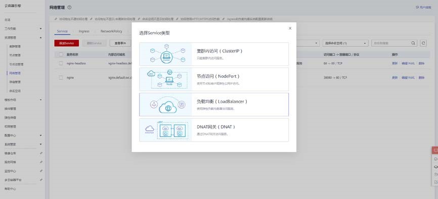 选择菜单栏资源管理>网络管理,点击添加 service,选择负载均衡。