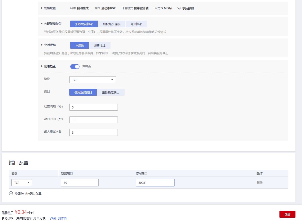 配置策略类型为加权轮询算法,不启用会话保持,启动健康检查,配置容器端口为 80,访问端口为 30081。