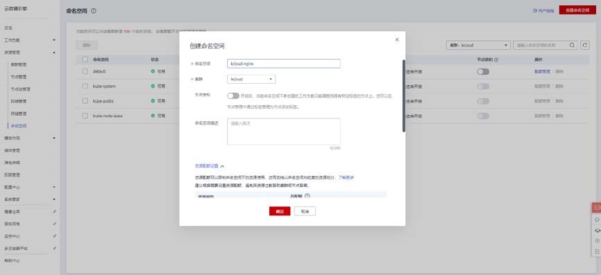 点击菜单栏中资源管理>命名空间,进入命名空间控制台,在 kcloud 集群中创建 kcloud-nginx 命名空间。
