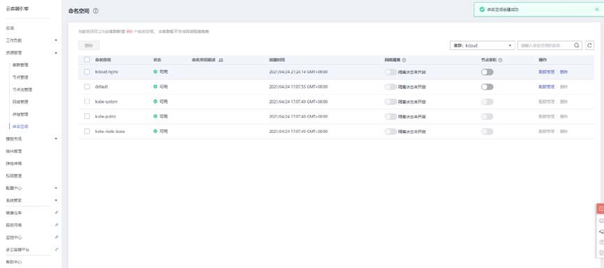 创建完成后可以在命名空间列表中查看到所创建的命名空间 kcloud-nginx。