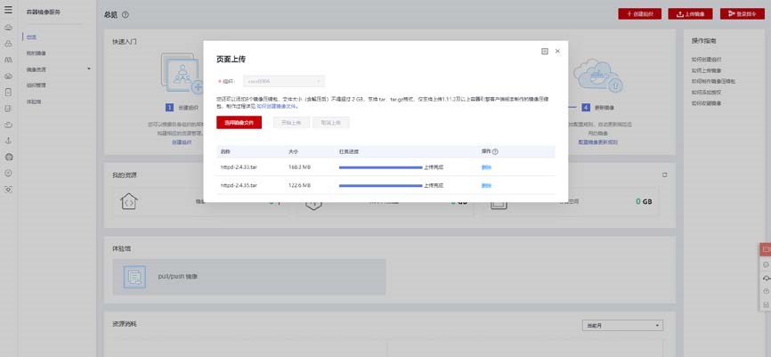 点击上传镜像按钮,选择所创建的组织,选择提供的镜像文件 httpd-2.4.33.tar 和 httpd-2.4.35.tar,点击开始上传。