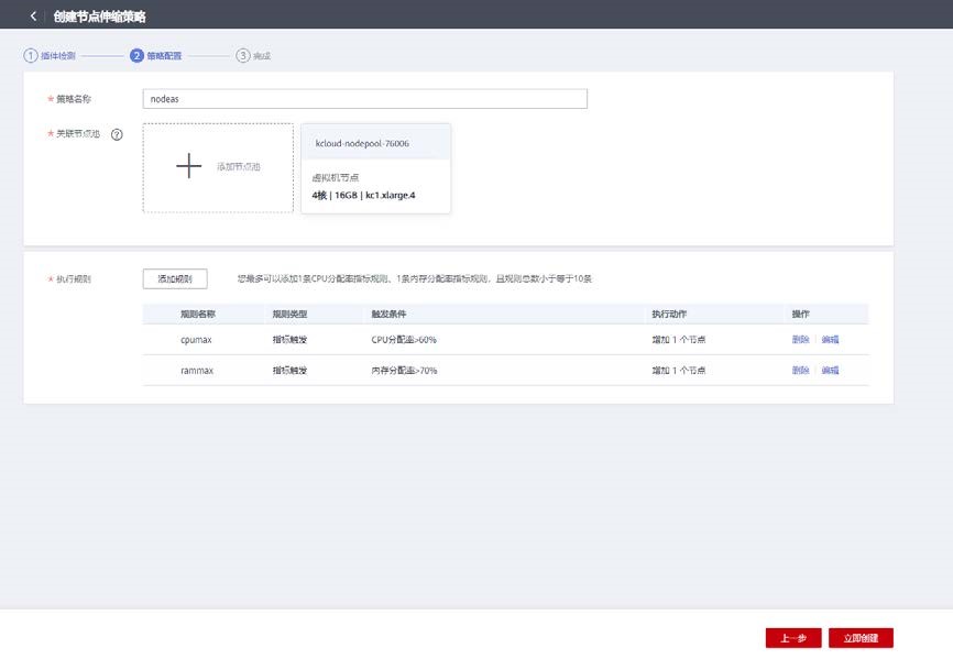 配置策略名称 nodes,关联所创建的节点池,配置添加策略。当 CPU 分配率大于 60%,增加一个节点。当内存分配率大于 70%,增加一个节点。