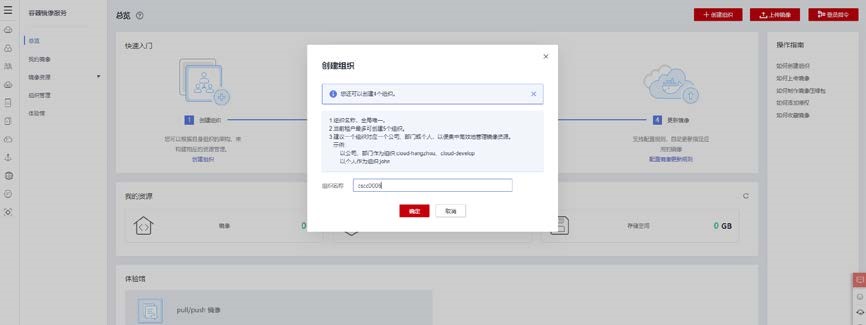点击页面服务列表>容器服务>容器镜像服务 SWR,点击创建组织名称(名称不能与任
