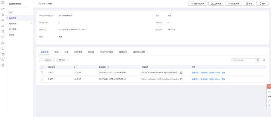 点击我的镜像菜单,可以查看到所上传的 httpd 镜像和对应版本信息。