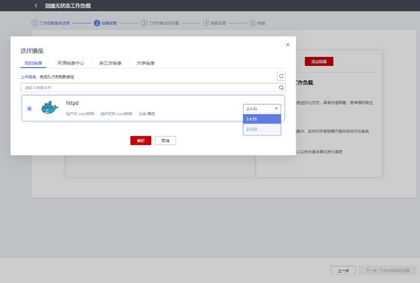 点击添加容器,在我的镜像中可以查看到所上传的 httpd 镜像,在镜像后可以选择对应版本,这里选择 2.4.33 版本。