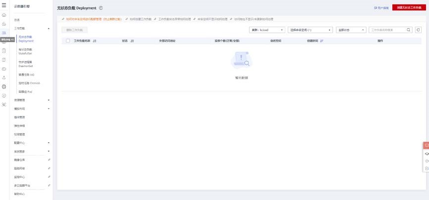 点击页面服务列表>容器服务>云容器引擎 CCE,点击工作负载>无状态负载,创建一个 deployment。