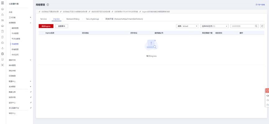 页面左侧菜单栏点击资源管理>网络管理,找到 Ingress 选项,点击添加 Ingress。