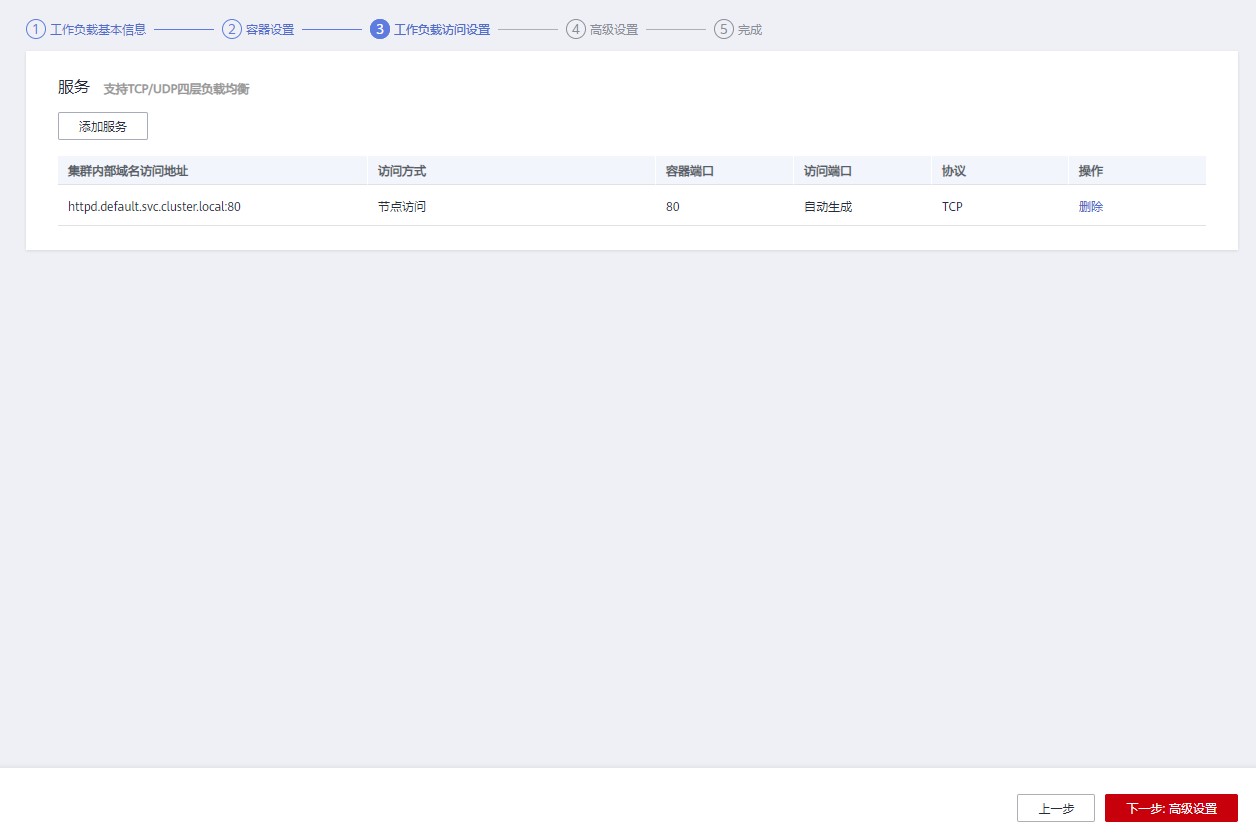 点击添加服务,添加一个访问方式为节点访问,容器端口为 80 的服务。然后点击下一步后创建 deployment。