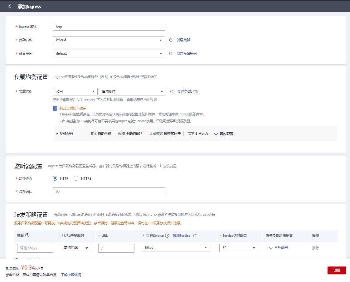 配置名称为 http,选择 kcloud 集群 default 命名空间,配置负载均衡为公网访问,自动创建即可。监听器配置协议为 http,对外端口为 80。在转发策略配置 URL 处填写/,选择目标 Service 为 httpd。点击创建。