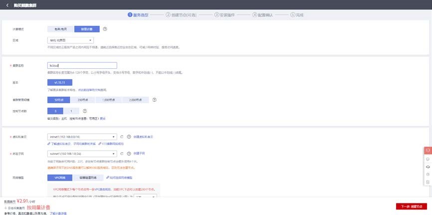 选择计费模式为按需计费,设置集群名称为 kcloud,集群版本选择 V1.15.11,集群管理规模根据需求自行选择需要多少个节点。控制节点数量根据集群要求选择 3 个,虚拟私有云网络为节点网络,选择为 intnet1 网络和 subnet1 子网。