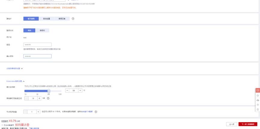 配置登录方式为密码登录,设置密码为 Abc@1234,点击 kubernetes 高级配置,设置节点最大实例数,防止管理过多容器 Pod 而负荷过高。