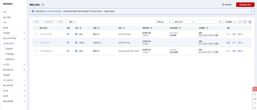 打开网络控制台>弹性公网 IP 和带宽>弹性公网 IP 地址,购买一个弹性公网 IP。