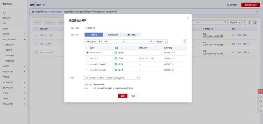 点击购买的弹性公网 IP 地址,将其绑定在 kcloud 容器集群的节点上。