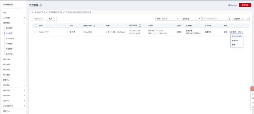 打开云容器引擎>资源管理>节点管理,点击节点后的更多按钮,点击同步节点信息即