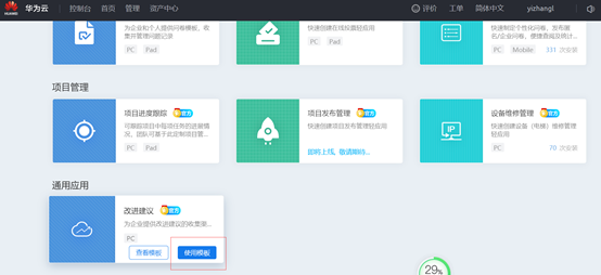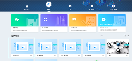 在“轻应用”页面,找到“改进建议”模板,并单击“使用模板”。