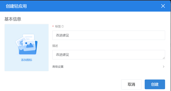 本示例以创建AppCube改进建议应用为例,介绍如何把AppCube上开发的应用发布成WeLink(蓝标)轻应用。