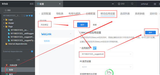 - 显示名称:AppCube改进建议应用在移动端显示的名称,本示例配置为“WeLink轻应用设置”。设置后,单击“保存”。