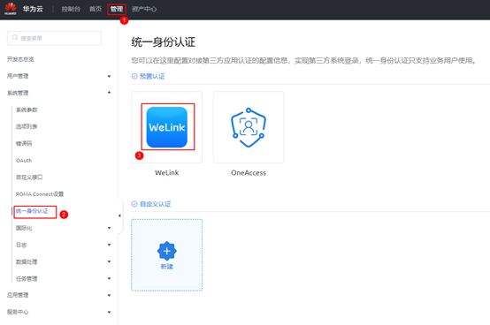 在左侧导航栏中,选择“管理 > 系统管理 > 统一身份认证设置”,单击“WeLink”。