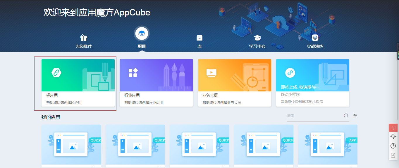 点击“进入开发环境”,打开如下图;这里可以进行创建不同的项目:轻应用,行业应用,业务大屏;还可以在“学习中心”学习相关开发视频。