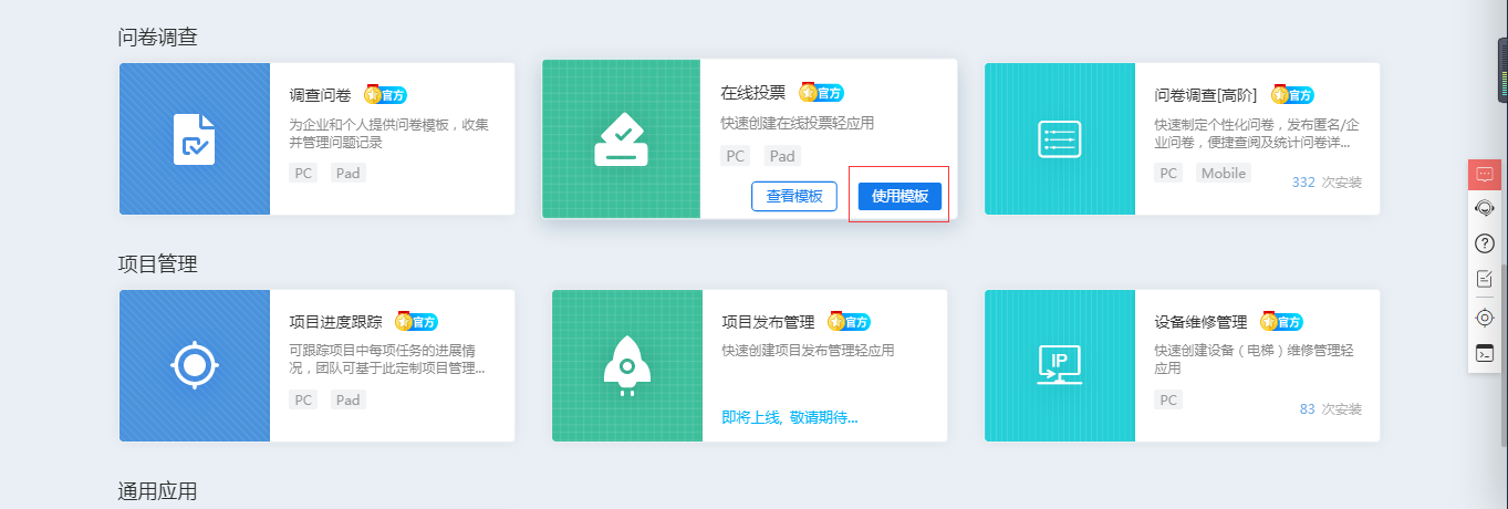 本次我们选择“调查问卷”创建应用,点击“在线投票”。
