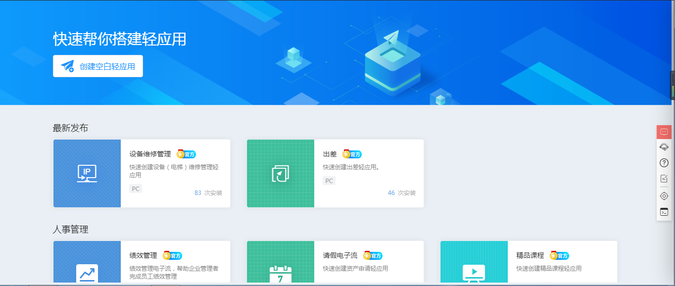 选择“轻应用”,打开如下图;可以创建空白轻应用,也可以选择已有的模板进行创建。