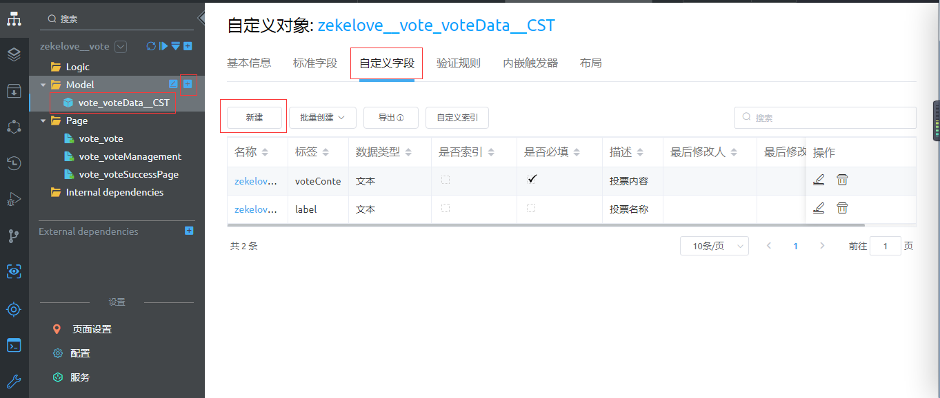 在“Model”文件夹右侧“+”可以创建新的对象模型,点击已创建好的模型“vote_voteData__CST”,右侧标签页“自定义字段”可以看到有两个字段名称:label(投票名称),voteConte(投票内容),可以点击“新建”增加新的字段。